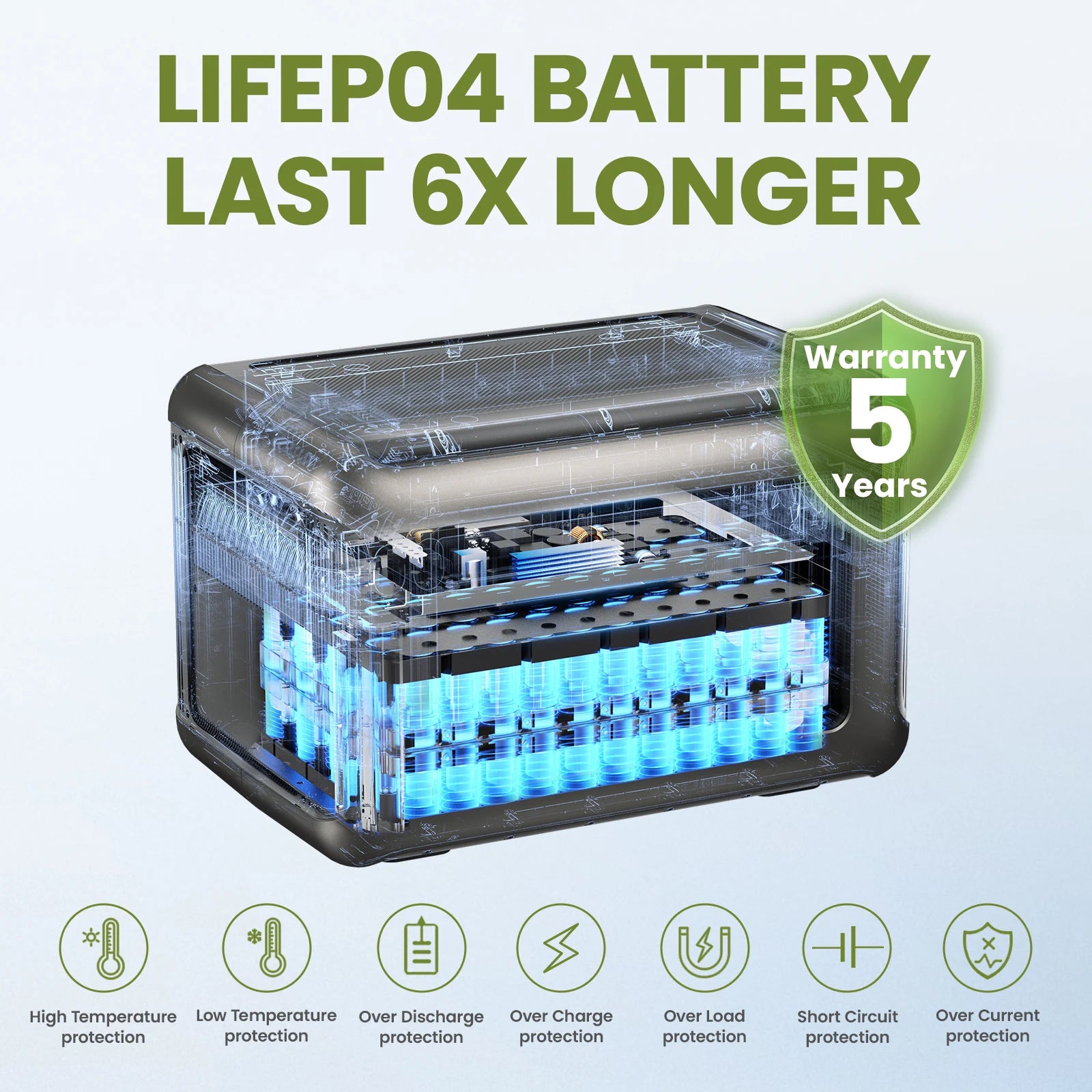 [Long-Lasting LiFePO4 Battery & Large Expandable Capacity] This ALLPOWERS R3500 power station features LiFePO4 battery. The maximum battery capacity is higher than 80% after 3500 cycles of charging and higher than 50% after 6500 cycles. Therefore R3500 lifespan exceeds 10 years. The R3500 can be expanded with up to 6 B3000 (3168Wh each) extended batteries and the capacity is increased to a maximum of 22176Wh, which is enough to survive severe power outages.