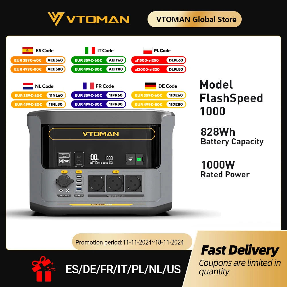 VTOMAN FlashSpeed 1000 Portable Power Station 2000W 828Wh LiFeP04 Battery For Outdoor Camping Tent Travel