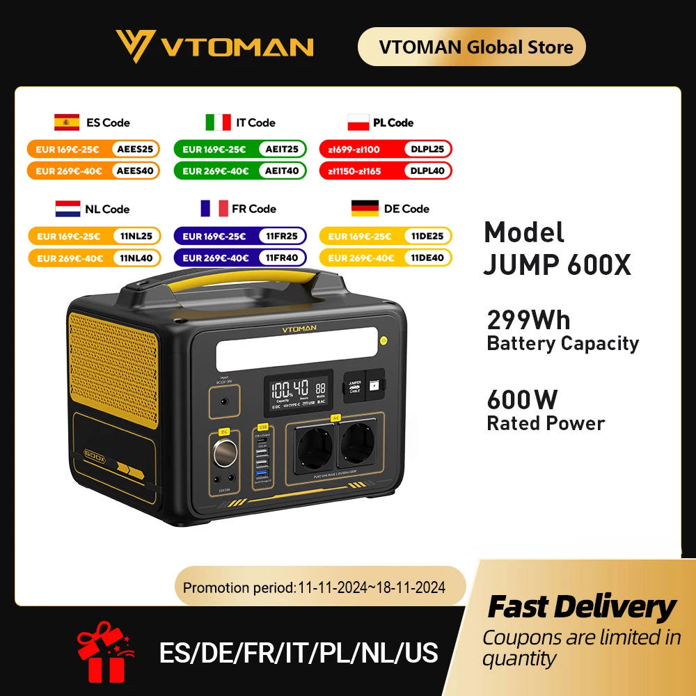 VTOMAN JUMP 600X Portable Power Station 299Wh Solar Generator LiFePO4 1200W Peak Power Powerstation Emergency Backup
